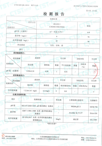 2024年1月20日,best365英国官网委托第三方检测公司江苏国测检测技术有限公司于best365英国官网厂区北侧雨水排放口取雨水水样进行检测,监测指标为COD(化学需氧量)、悬浮物和PH值,检测结果:COD:25mg/l,悬浮物:6mg/l ,PH:6.7,水质结果判定符合《地表水环境质量标准》标准中表1中IV类标准,COD:30 mg/l,PH值范围:6-9,悬浮物:70 mg/l。