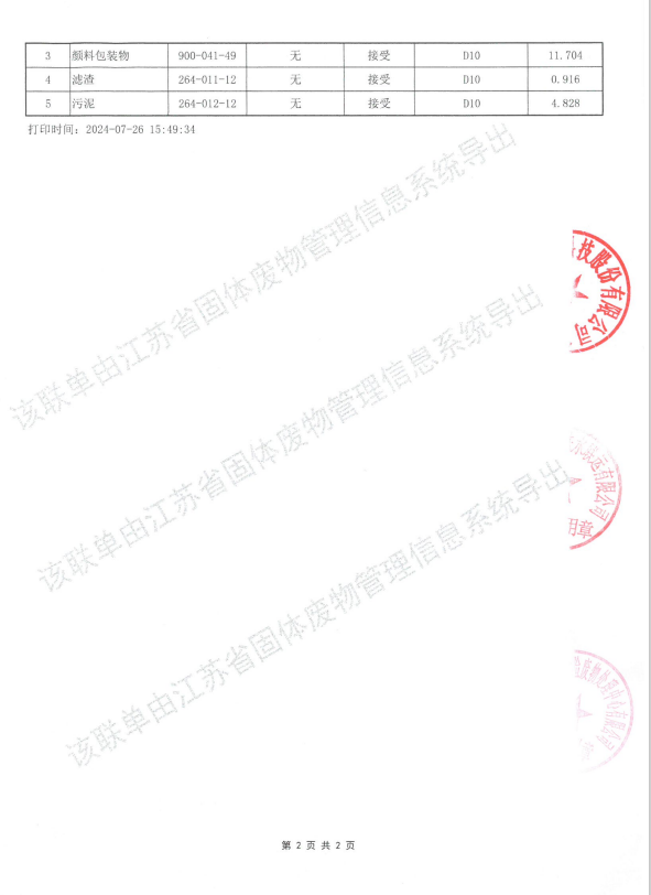 2024年07月24日,best365英国官网委托危险废弃物运输单位张家港市港锡公铁水联运有限公司、处置单位张家港市华瑞危险废物处理中心有限公司转移及处置危险废弃物,所转移及处置的危险废弃物分别为:滤渣(264-011-12)0.916吨、污泥(264-012-12)4.828吨、浓缩液(264-011-12)1.077吨、实验废物(900-047-49)0.019吨、颜料包装物(900-041-49)11.704吨,所处置及转移的危险废弃物经过《江苏省生态环境厅江苏省污染源“一企一档”管理系统》申报审批通过,转移及处置量在危险废弃物管理计划内。