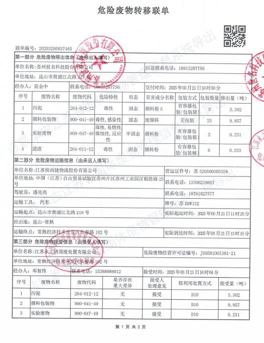 2025年3月21日,best365英国官网委托危险废弃物运输单位江苏快而捷物流股份有限公司、处置单位江苏永之清固废处置有限公司转移及处置危险废弃物,所转移及处置的危险废弃物分别为:滤渣(264-011-12)0.333吨、污泥(264-012-12)3.302吨、颜料包装物(900-041-49)9.857吨、实验废物(900-047-49)0.231,所处置及转移的危险废弃物经过《江苏省生态环境厅江苏省污染源“一企一档”管理系统》申报审批通过,转移及处置量在危险废弃物管理计划内。
