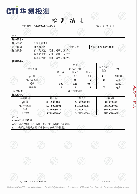 2025年10月27日,best365英国官网委托第三方检测公司苏州市华测检测技术有限公司于best365英国官网厂区北侧雨水排放口取雨水水样进行检测,监测指标为COD(化学需氧量)、悬浮物和PH值,检测结果:COD:17.3mg/l,悬浮物:12mg/l ,PH:7.16,水质结果判定符合《地表水环境质量标准》标准中表1中IV类标准,COD:30 mg/l,PH值范围:6-9,悬浮物:70 mg/l。